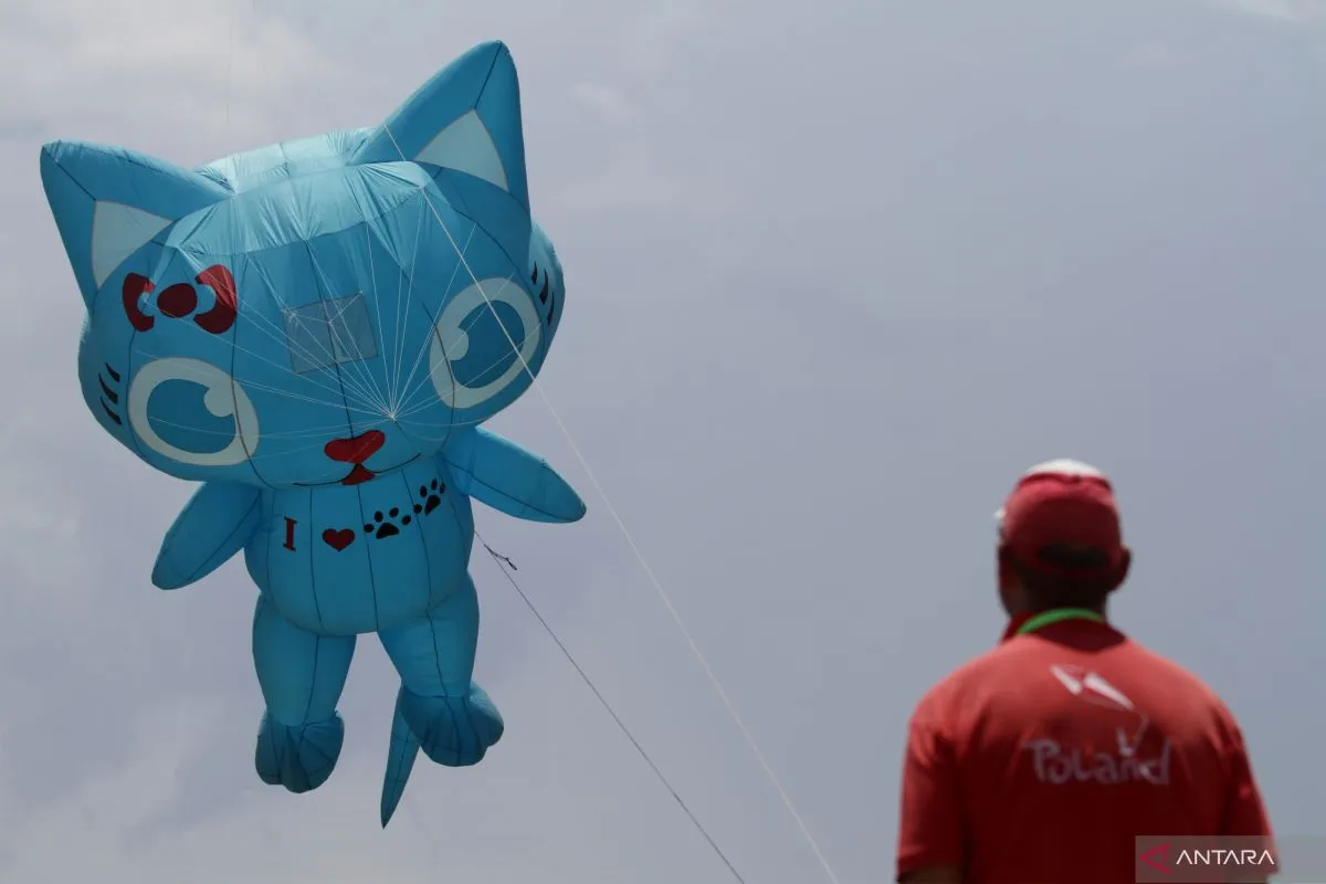 Peserta asal Polandia menerbangkan layangnya saat Festival Layang-layang Internasional 2022 di Long Beach Area Selatan, Pakuwon City, Surabaya, Jawa Timur, Sabtu (1/10/2022). Festival yang diikuti 92 peserta dari berbagai daerah di Indonesia serta dari mancanegara yakni Swedia, Polandia, Jepang dan Singapura tersebut memperlombakan kategori layang-layang dua dimensi, layang-layang tiga dimensi serta layang-layang rangkaian/train bukan naga. Antara Jatim/Moch Asim/zk.