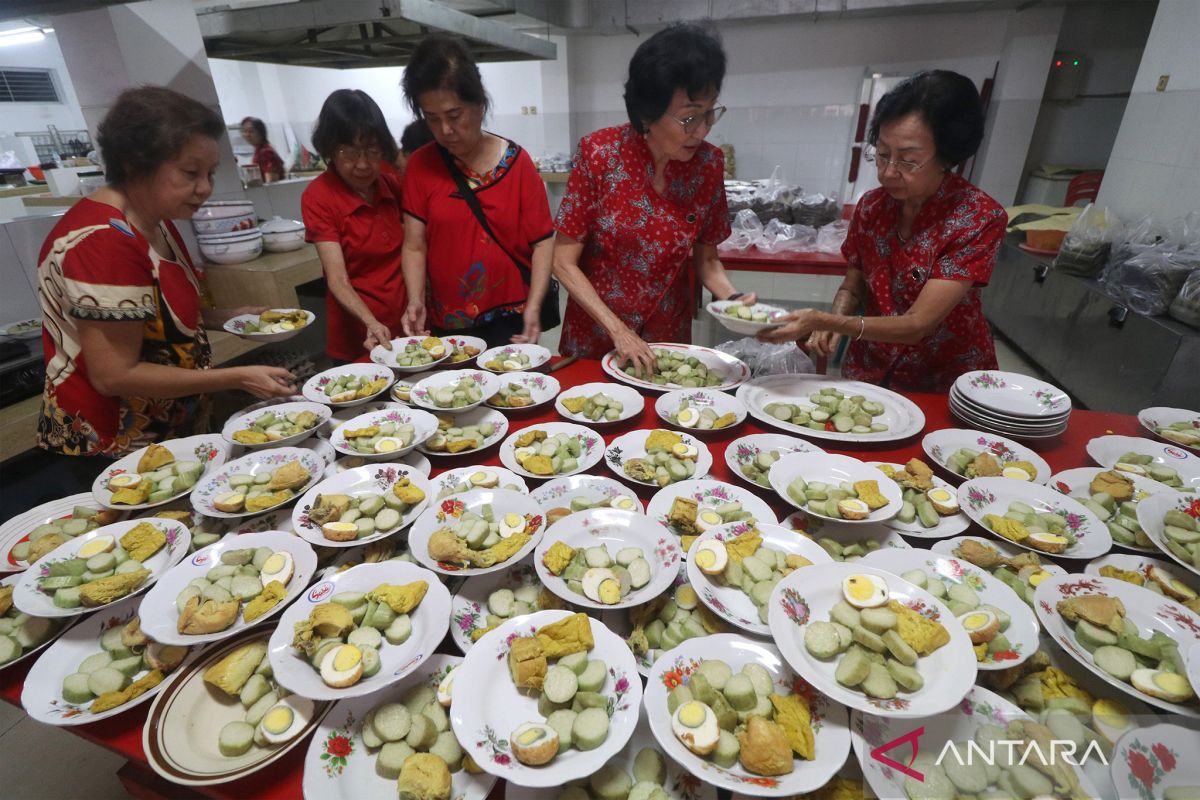 Warga Tionghoa menyiapkan lontong beserta lauk pauknya ke dalam piring di Klenteng Tjoe Hwie Kiong, Kota Kediri, Jawa Timur, Minggu (5/2/2023). Sebanyak 550 porsi lontong disajikan untuk dimakan bersama saat merayakan Cap Go Meh sebagai rangkain penutupan perayaan Tahun Baru Imlek. ANTARA Jatim/Prasetia Fauzani/zk