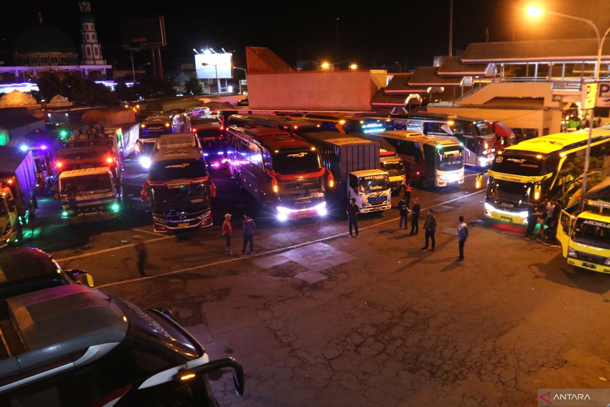 Sejumlah bus dan truk antre memasuki kapal di kantong parkir Pelabuhan Ketapang Banyuwangi, Jawa Timur, Sabtu (15/4/2023)Dinihari. Pada malam hari kendaraan yang akan menyeberang ke Bali didominasi truk pengangkut barang dan bus. ANTARA Jatim/Budi Candra Setya/zk