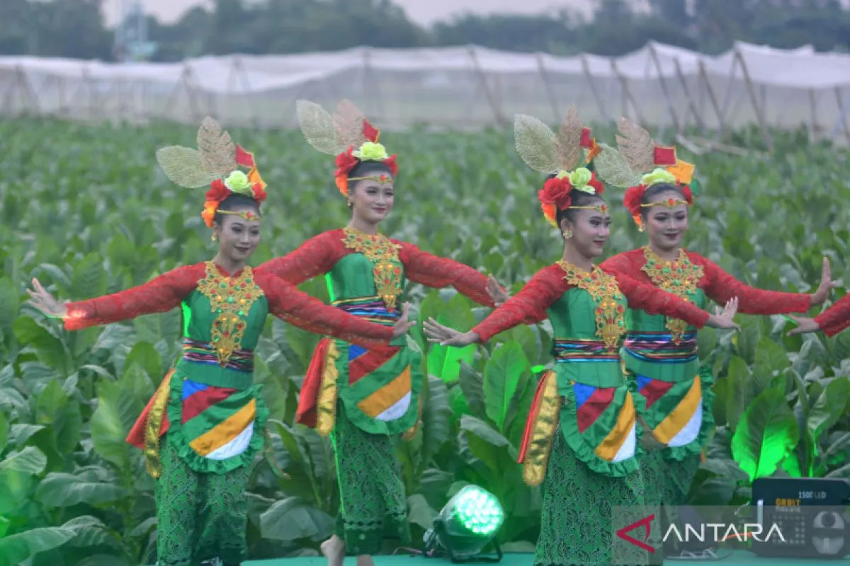Sejumlah penari menampilkan Tari Lah Bako di lahan tembakau dalam festival Jember Kota Cerutu Indonesia (JKCI) ke-5 di Jember, Jawa Timur, Sabtu (22/7/2023). Festival JKCI tersebut digelar karena Jember sebagai sentra tembakau dan cerutu di Indonesia, dengan produksi cerutu Jember 9.000 ton per tahun dan melibatkan 90 ribu petani. ANTARA Jatim/Seno/zk