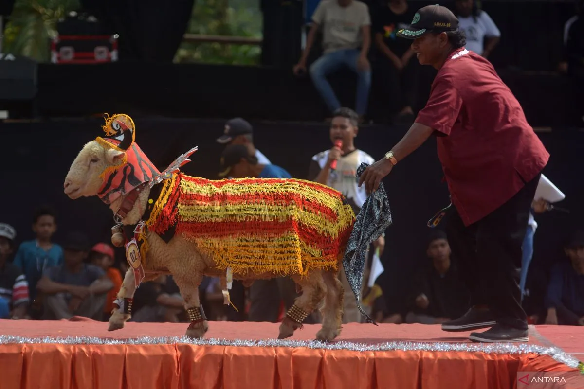 Peserta mengikuti lomba fashion show domba di Desa Suco, Mumbulsari, Jember, Jawa Timur, Jumat (15/9/2023). Fashion show domba tersebut digelar untuk memperingati Hari Jadi Desa Suco ke-110 tahun, dan untuk mengukuhkan desa itu sebagai sentra peternakan domba. ANTARA Jatim/Seno/ZK