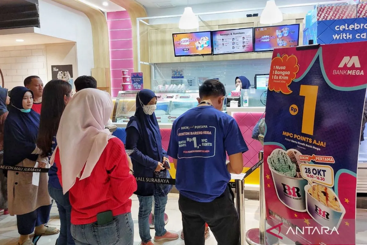 Pengunjung mengantri membeli es krim Baskin Robbins dengan harga Rp1 saat Bank Mega Ajak Makan Es Krim Hanya Dengan Rp1 MPC Point “bikin jadi pertama” di Trans Icon Mall, Surabaya, Jawa Timur, Sabtu (28/10/2023). Kegiatan yang mengusung slogan tersebut Satu Nusa, Satu Bangsa, Satu Es Krim Favorit Kita tersebut merupakan bentuk apresiasi kepada pemegang kartu kredit Bank Mega yang tersebar di Indonesia sekaligus dalam rangka memperingati Hari Sumpah Pemuda. ANTARA Jatim/doc Bank Mega/zk