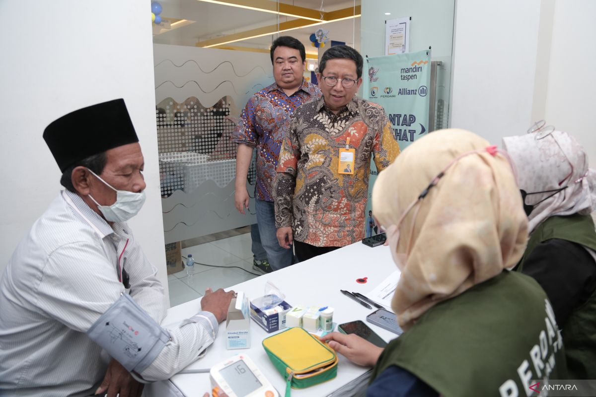 Direktur IT dan Digital Bank Mandiri Taspen Widi Nugroho (tengah) didampingi Ketua Perhimpunan Dokter Spesialis Mata Indonesia (Perdami) Jatim Muhammad Firmansjah (kedua kiri) meninjau proses penyaringan (screening) pasien katarak saat bakti sosial dalam rangka HUT ke-9 Bank Mandiri Taspen di Surabaya, Jawa Timur, Rabu (24/1/2024). Bank Mandiri Taspen bekerja sama dengan Allianz Indonesia melaksanakan kegiatan screening katarak untuk 100 nasabah terdaftar. Program tersebut merupakan bagian dari rangkaian operasi katarak sebagai salah satu inisiatif Mantap Sehat yang merupakan salah satu dari tiga pilar Mantap Indonesia milik Bank Mandiri Taspen dalam mendukung program kesehatan berkelanjutan yang diharapkan berkontribusi besar dalam mencegah kebutaan akibat katarak sehingga dapat meningkatkan produktivitas serta kesejahteraan nasabah dan keluarganya. Antara Jatim/Moch Asim.