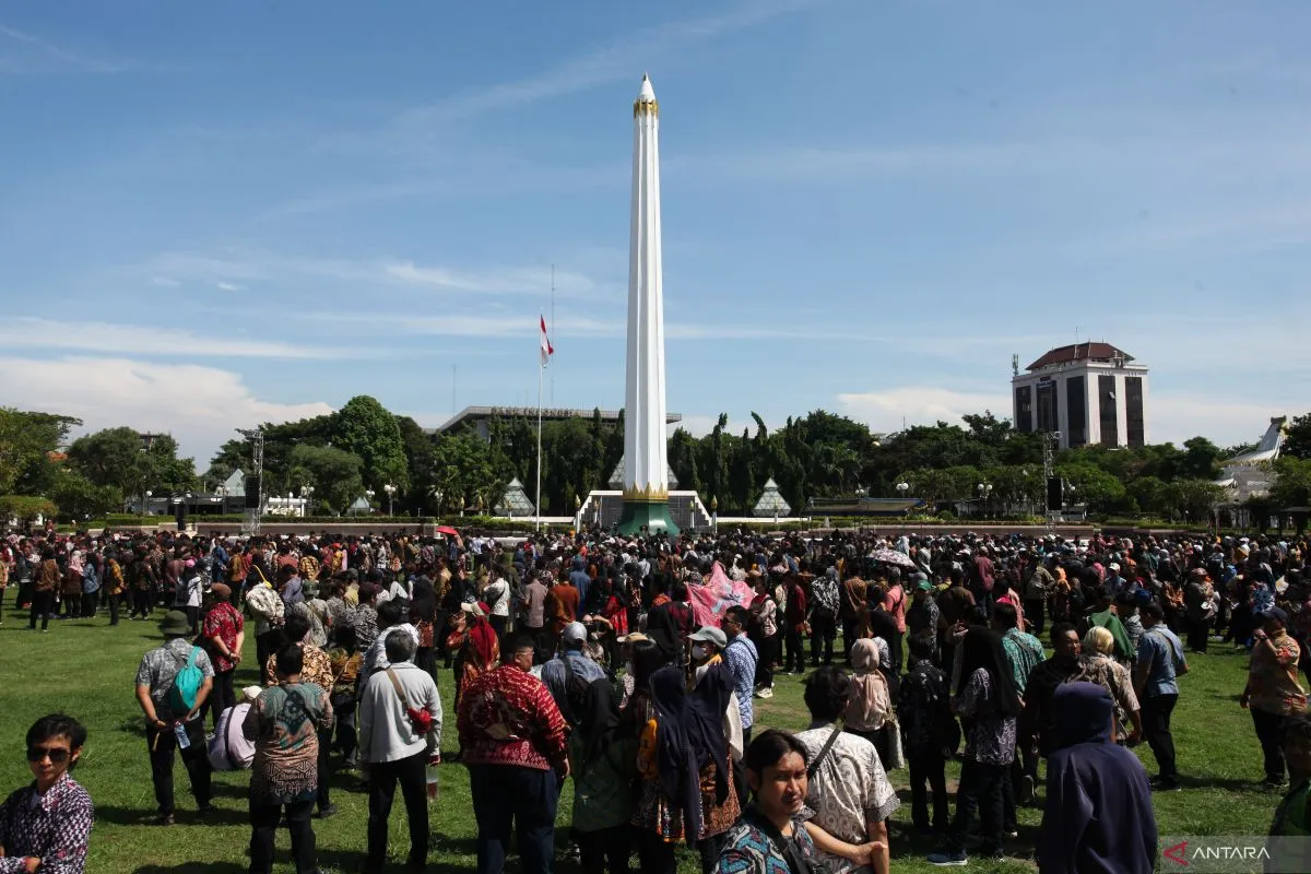 Sejumlah anggota Kelompok Penyelenggara Pemungutan Suara (KPPS) Kota Surabaya mengikuti pelantikan di Tugu Pahlawan, Surabaya, Jawa Timur, Kamis (25/1/2024). Komisi Pemilihan Umum (KPU) Kota Surabaya melantik 57.169 anggota Kelompok Penyelenggara Pemungutan Suara (KPPS) Kota Surabaya yang bertugas di 8.167 Tempat Pemungutan Suara (TPS) di Surabaya pada Pemilu 2024. Antara Jatim/Didik Suhartono.