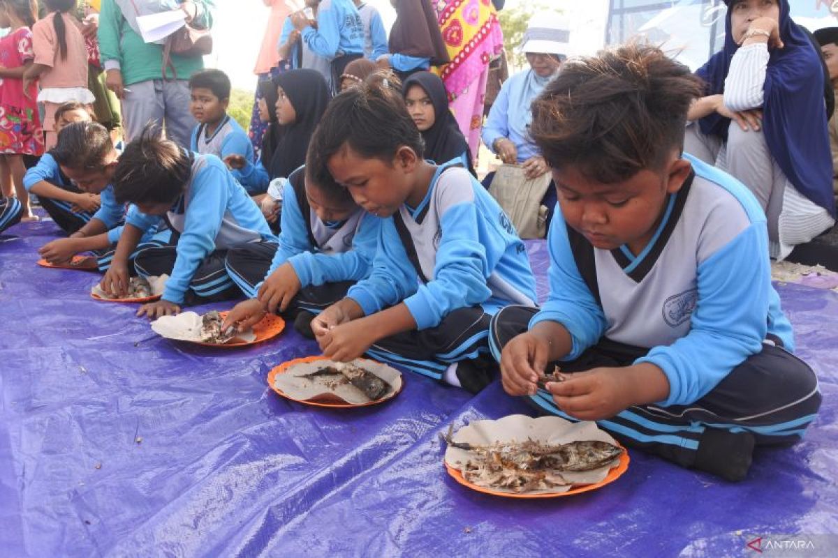 Sejumlah siswa mengikuti lomba memakan ikan tongkol (Euthynnus affinis) dalam Fishing Camp 2024 di Pantai Sijile, Desa Sumberwaru, Banyuputih, Situbondo, Jawa Timur, Minggu (30/6/2024). Melalui lomba itu anak-anak diajak gemar makan ikan laut sebagai penunjang gizi. Antara Jatim/Seno/um