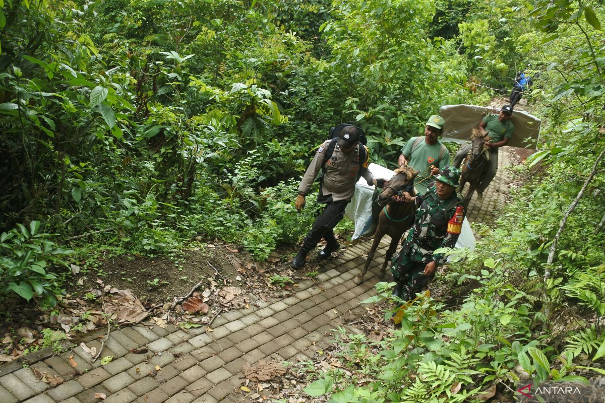 Petugas membawa logistik Pilkada menggunakan kuda di kawasan Taman Nasional Meru Betiri (TNMB) Desa Andongrejo, Tempurejo, Jember, Jawa Timur, Selasa (26/11/2024). Logistik Pilkada 2024 menuju TPS 10 Dusun Sumbersalak harus diangkut memakai kuda untuk mempercepat proses pengiriman karena sulitnya medan TNMB, dan ada 108 DPT di TPS itu. Antara Jatim/Seno/um
