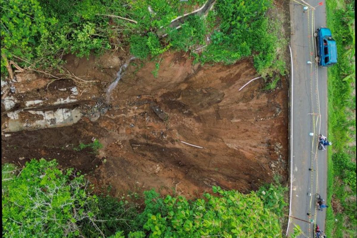 Foto udara jalan penghubung antar dusun yang ambles akibat banjir di Desa Rejoyoso, Kecamatan Bantur, Kabupaten Malang, Jawa Timur, Jumat (29/11/2024). Berdasarkan hasil identifikasi sementara Badan Penanggulangan Bencana Daerah (BPBD) Kabupaten Malang, enam titik banjir dan empat titik tanah longsor yang tersebar di enam kecamatan pada Kamis (28/11) tersebut menyebabkan 82 KK atau 283 Jiwa terdampak juga delapan rumah dan tiga jembatan rusak. Antara Jatim/Irfan Sumanjaya/um