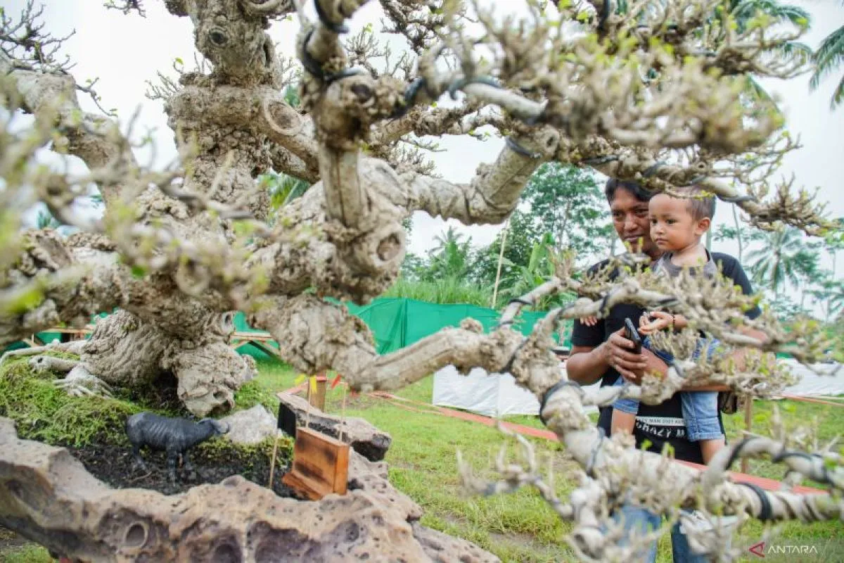 Pengunjung mengamati pohon bonsai saat gelaran Pameran dan Kontes Bonsai Nasional di Desa Kedawung, Padang, Lumajang, Jawa Timur, Rabu (8/1/2025). Pameran dan kontes bonsai yang berlangsung hingga 13 Januari 2025 tersebut menampilkan 561 pohon yang harganya mulai dari Rp500 ribu hingga Rp 350 juta dan diikuti oleh sedikitnya 450 peserta dari sejumlah daerah di Indonesia. ANTARA Jatim/Irfan Sumanjaya/mas.