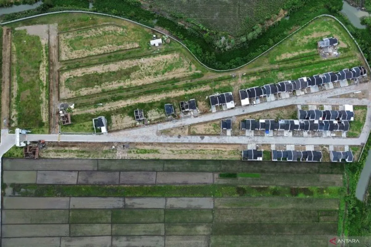 Foto udara kompleks pembangunan perumahan di kawasan Wonoayu, Sidoarjo, Jawa Timur, Minggu (12/1/2025). BTN menargetkan pembiayaan 150.000 rumah rendah emisi dengan penggunaan material ramah lingkungan minimal 10%, secara bertahap meningkat menjadi 30% pada 2029. Antara Jatim/Umarul Faruq