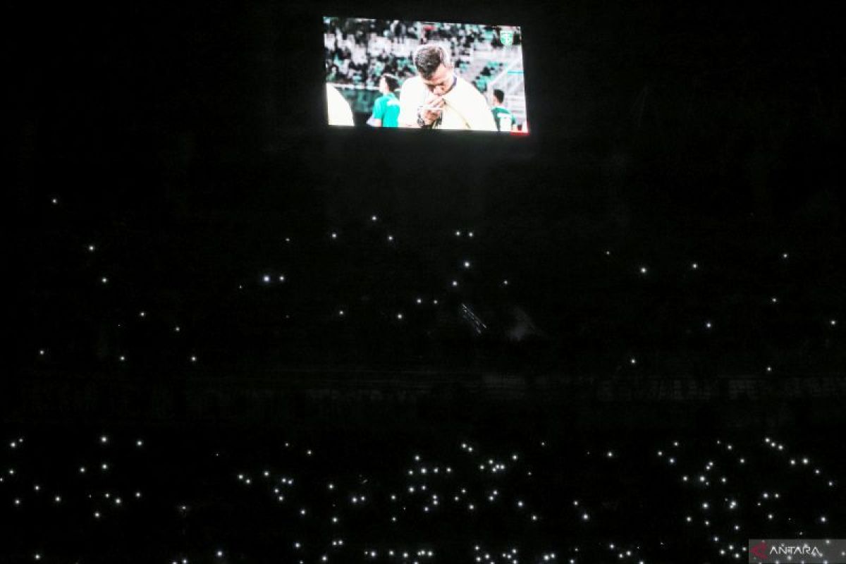 Surabaya (ANTARA) - Pesepak bola Rachmat Irianto (Rian) bersama keluarga turut menjadi saksi aksi "One Minute Silent, Tribute To Bejo Sugiantoro" sebelum pertandingan melawan Persib Bandung, si Stadion GBT Surabaya, Sabtu malam.