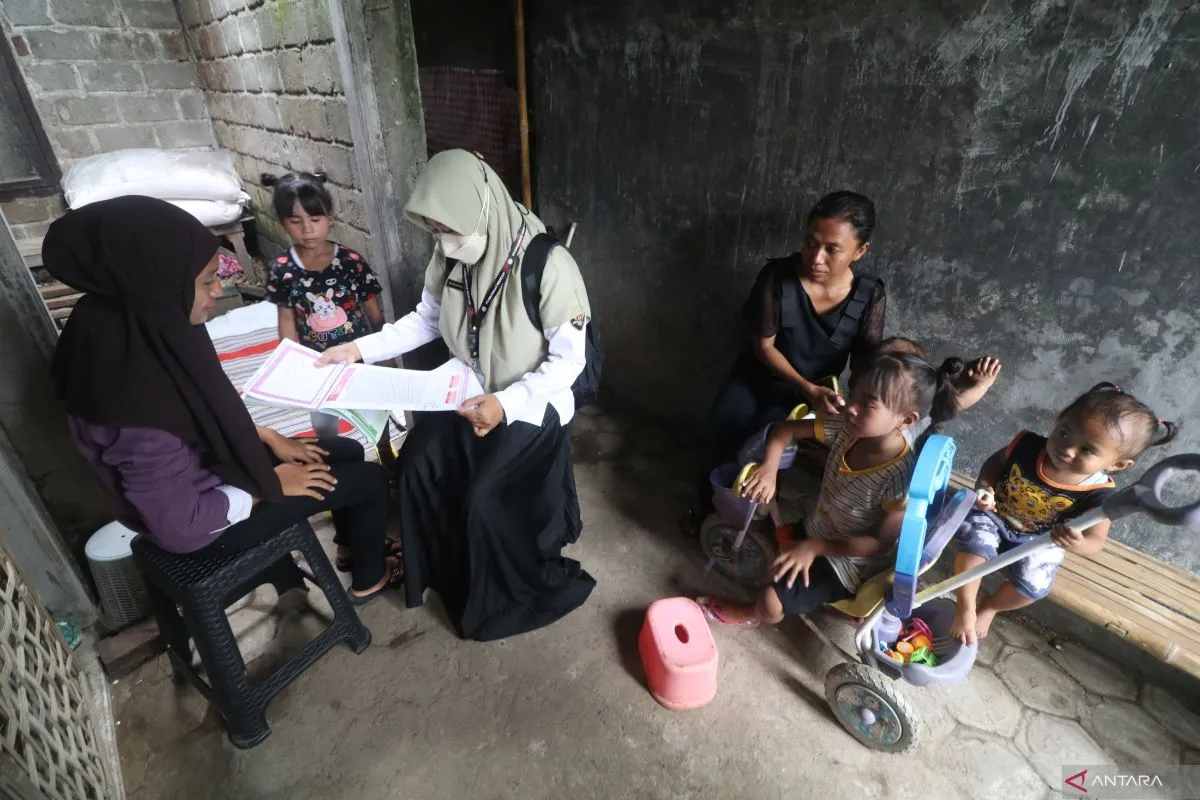 Seorang petugas kesehatan dari puskesmas mengamati grafik berat badan anak pada buku Kartu Menuju Sehat (KMS) saat monitoring balita stunting di Kelurahan Gayam, Kota Kediri, Jawa Timur, Rabu (28/5/2025). Survey Status Gizi Indonesia (SGI) 2024 Kementerian Kesehatan mencatat prevalensi stunting nasional menurun dari 21,5 persen pada 2023 menjadi 19,8 persen pada 2024 dan pemerintah komitmen menurunkan angka stunting nasional menjadi 14,2 persen pada 2029. Antara Jatim/Prasetia Fauzani/um