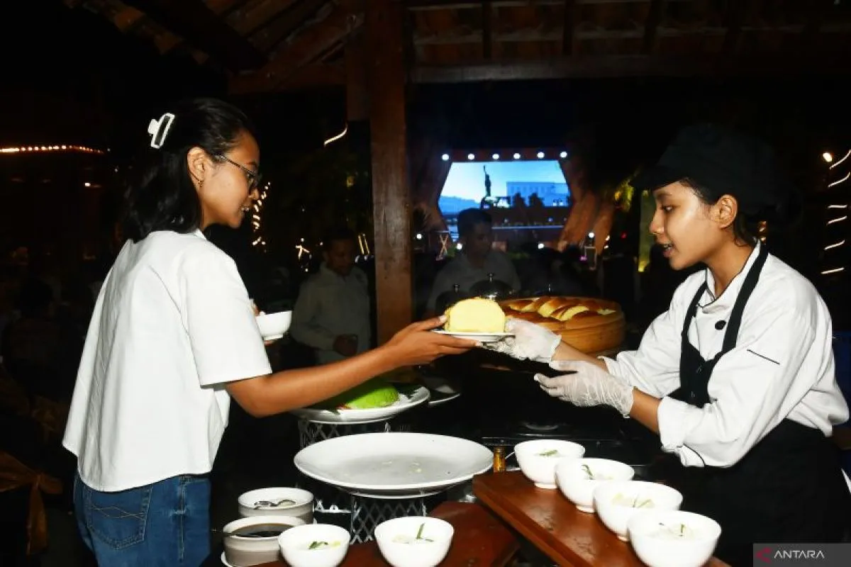 Petugas stan kuliner melayani pengunjung saat digelarnya Kedaton Rustik Culinary Festival 2025 di Kota Madiun, Jawa Timur, Kamis (12/6/2025). Kegiatan yang menyajikan berbagai jenis menu makanan, jajanan tradisional, dan minuman secara gratis kepada sekitar 500 undangan sebuah hotel tersebut dimaksudkan untuk memfasilitasi pelaku usaha mempromosikan dagangan kulinernya. Antara Jatim/Siswowidodo/um