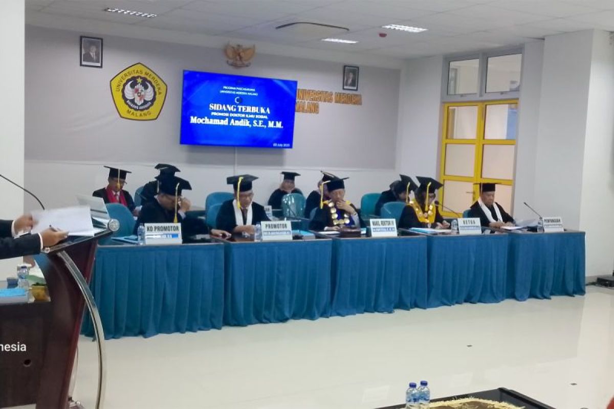 Malang (ANTARA) - Mochamad Andik meraih gelar doktor dari Prodi Doktor Ilmu Sosial Fakultas Parcasarjana Universitas Merdeka Malang, setelah mempertahankan disertasinya yang meneliti tentang perilaku pemilih milenial di Kota Malang.