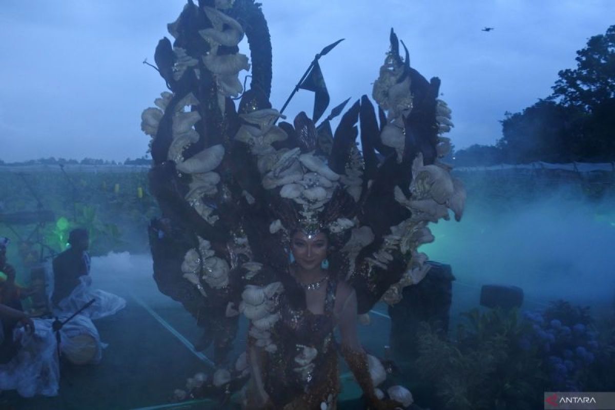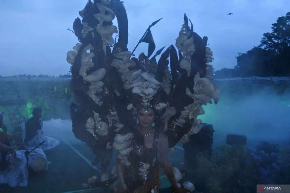 Sejumlah model menampilkan kostum Jember Fashion Carnaval di lahan tembakau dalam Festival Jember Kota Cerutu Indonesia (JKCI) ke-7 di Jember, Jawa Timur, Sabtu (12/7/2025). Festival JKCI digelar dengan mengangkat tema Savoring Tradition, Embracing the Future, untuk menguatkan industri cerutu sebagai identitas Kabupaten Jember. Antara Jatim/Seno/um