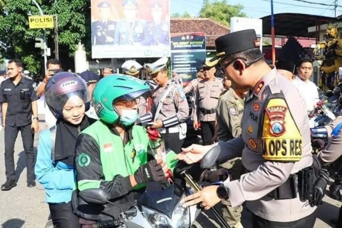 Kegiatan sosialisasi Operasi Patuh Semeru 2025 diwarnai dengan aksi simpatik Kapolres Magetan bersama Forkopimda setempat dan jajaran memberikan bunga, coklat, dan brosur keselamatan berlalu lintas kepada pengendara kendaraan di jalan depan Mako Polres Magetan.