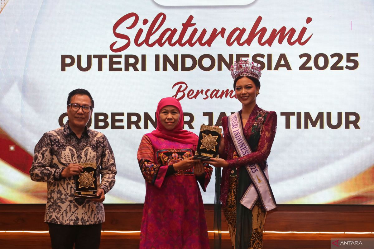 Gubernur Jawa Timur Khofifah Indar Parawansa (tengah) menyerahkan cendera mata kepada Puteri Indonesia 2025 Firsta Yufi Amarta Putri (kanan) dan Direktur Mustika Ratu Entertainment Mega Angkasa (kiri) saat menerima silaturahmi Puteri Indonesia 2025 di Gedung Negara Grahadi, Surabaya, Jawa Timur, Senin (14/7/2025). Silaturahmi Puteri Indonesia tersebut dalam rangka membagikan kisah dan inspirasi untuk kemajuan dan kemandirian perempuan khususnya di Jawa Timur. ANTARA Jatim/Moch Asim.