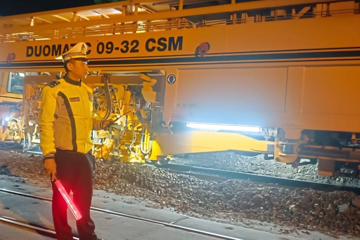 Petugas Satlantas Polres Lamongan mengamankan lokasi saat alat berat Multi Tie Tamper (MTT) digunakan dalam proses pemadatan rel di perlintasan sebidang JPL 317, Jalan Jaksa Agung Suprapto, Lamongan, Jawa Timur, Minggu (3/8/2025) dini hari. (ANTARA/HO-Satlantas Polres Lamongan)