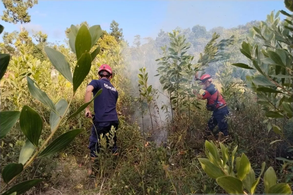 Ilustrasi: Tim pemadam kebakaran memadamkan api yang membakar hutan dengan cara tradisional, di Tanjungpandan, Minggu (3/8/2025) ANTARA/Apriliansyah