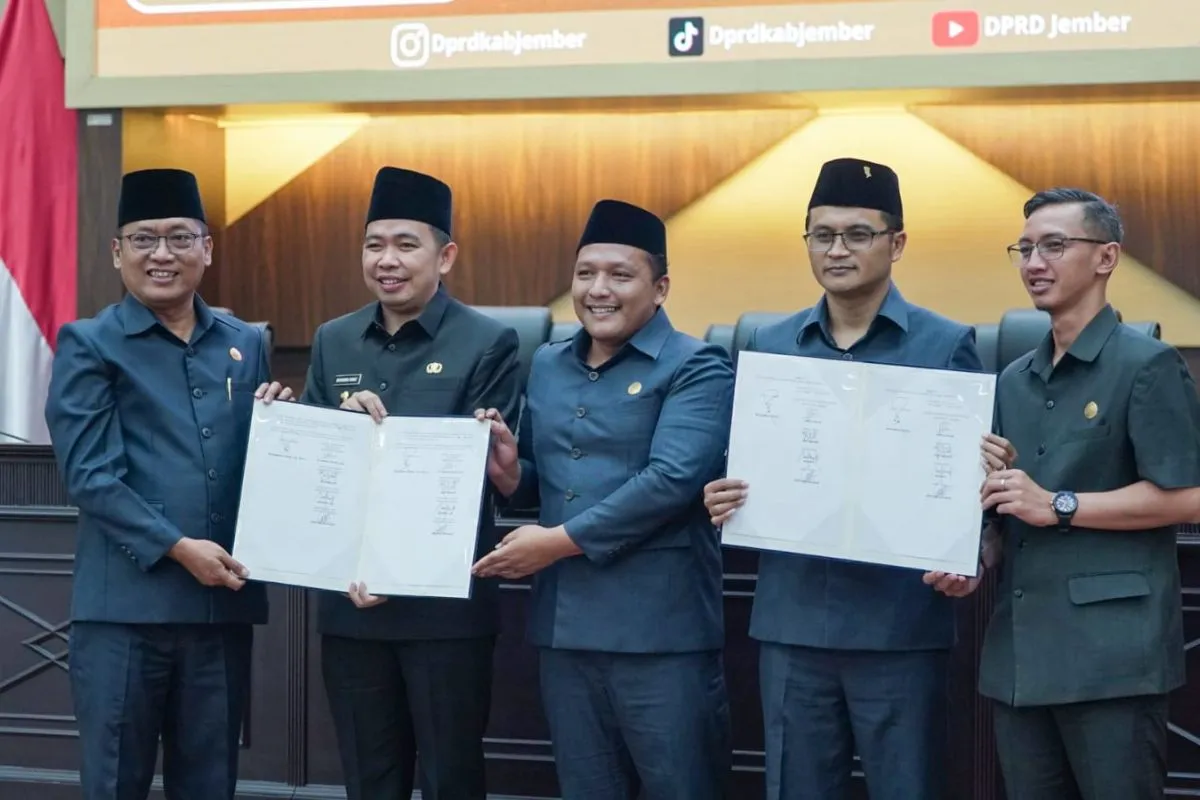 Bupati Jember Muhammad Fawait (dua dari kiri) bersama Ketua DPRD Jember Ahmad Halim (kiri) didampingi wakil ketua DPRD menunjukkan penetapan Raperda P-APBD 2025 dalam rapat paripurna di DPRD Jember, Kamis (7/8/2025). (ANTARA/HO-Diskominfo Jember)