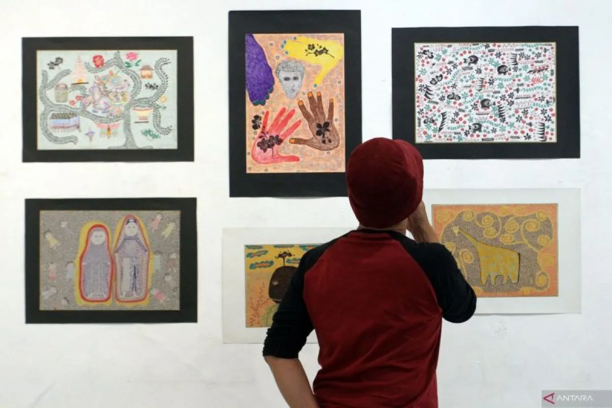 Pengunjung melihat lukisan yang dipajang dalam pameran berjudul Enviro Mental #3 di gedung Dewan Kesenian Malang, Jawa Timur, Senin (25/8/2025). Pameran tersebut diadakan hingga Jumat (29/8) dan menampilkan 20 lukisan bergaya naif art karya seniman Peni dan Sekar Taji dengan penggambaran anak-anak korban perang di Gaza. Antara Jatim/Ari Bowo Sucipto/um