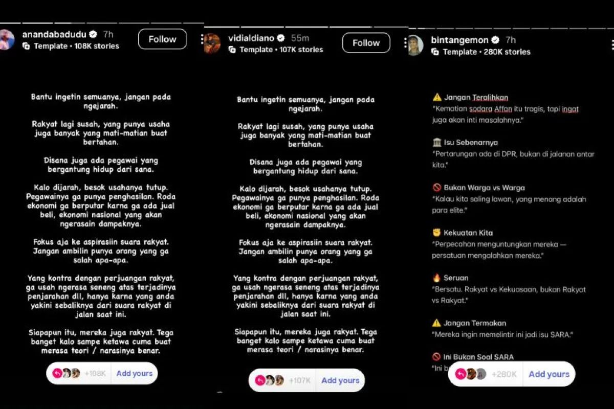 "Jangan teralihkan. Kematian saudara Affan itu tragis tapi ingat juga akan inti masalahnya. Isu Sebenarnya, Pertarungan ada di DPR bukan di jalanan antar kita," demikian bunyi stories yang dibagikan Bintang Emon.