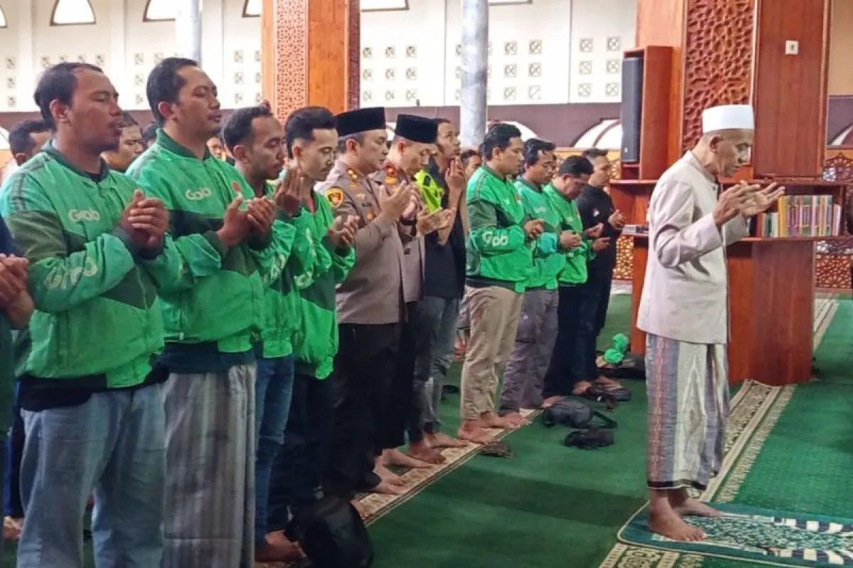 Lumajang, Jawa Timur (ANTARA) - Kepolisian Resor (Polres) Lumajang bersama ratusan pengemudi ojek online (ojol) menggelar shalat ghaib dan doa bersama untuk almarhum Affan Kurniawan di Masjid Agung KH. Anas Machfudz Kabupaten Lumajang, Jawa Timur, Sabtu.