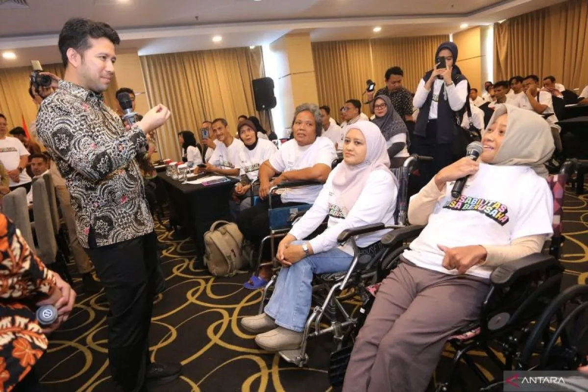Wakil Gubernur Jawa Timur Emil Elestianto Dardak (kiri) berbincang dengan peserta saat menghadiri pembukaan program kolaborasi pelatihan bertajuk Disabilitas Bisa Berusaha di Surabaya, Jawa Timur, Senin (15/9/2025). Pelatihan yang diikuti 50 peserta tersebut digagas PT Permodalan Nasional Madani (PNM) berkolaborasi dengan mitra strategis yaitu PT Bank IBK Indonesia Tbk, PT Jaminan Kredit Indonesia, PT Pelabuhan Indonesia Regional 3, PT SIER, dan PT Pegadaian guna membuka akses, memberikan pelatihan, serta mendukung kemandirian penyandang disabilitas agar mampu mengembangkan usaha dan menjadi bagian penting dari roda perekonomian bangsa. ANTARA Jatim/Moch Asim.