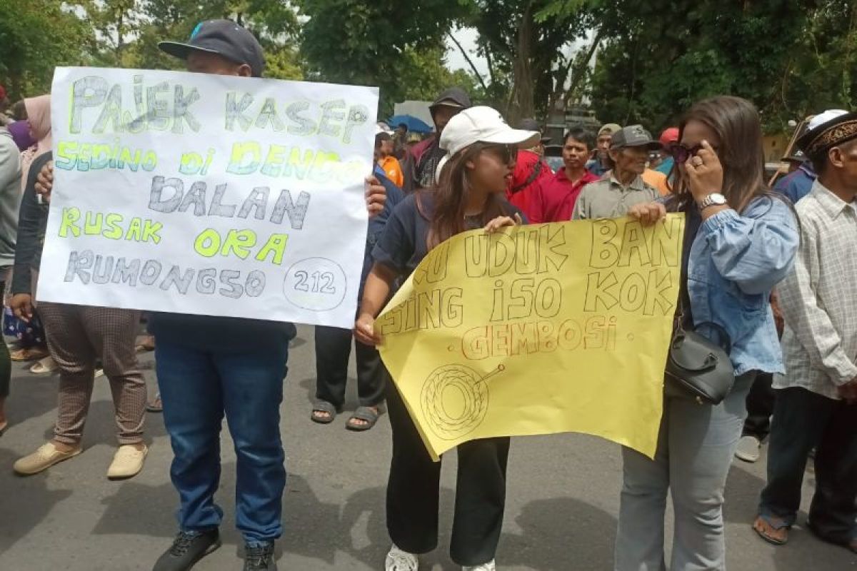 Tulungagung, Jawa Timur (ANTARA) - Ratusan warga menggelar aksi unjuk rasa di depan kantor Dewan Perwakilan Rakyat Daerah (DPRD Tulungagung) untuk menuntut perbaikan jalan selingkar Waduk Wonorejo yang rusak dan hingga kini belum dilakukan perbaikan.
