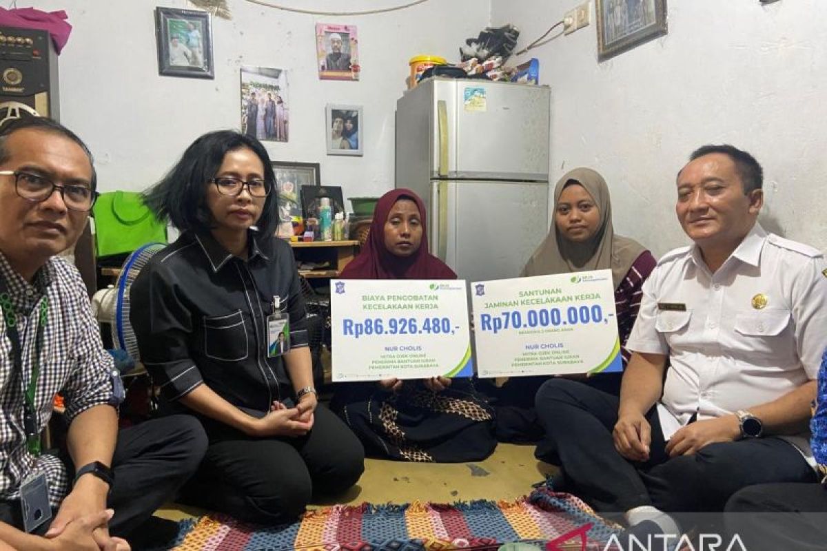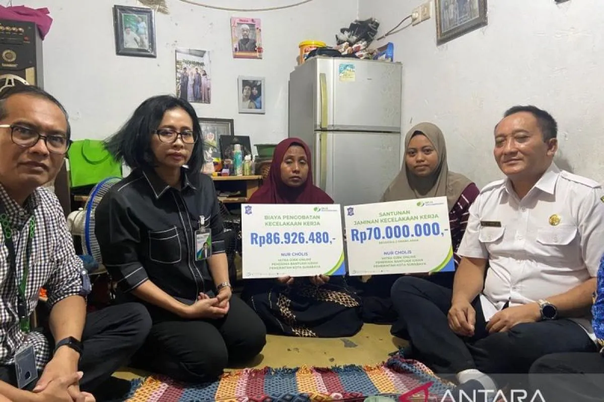 Kepala Dinas Tenaga Kerja Kota Surabaya Agus Hebi Djuniantoro di Surabaya, Kamis mengatakan keluarga almarhum menerima santunan jaminan sosial ketenagakerjaan sebesar Rp70 juta serta biaya perawatan rumah sakit sebesar Rp86.926.480 dari BPJS Ketenagakerjaan.