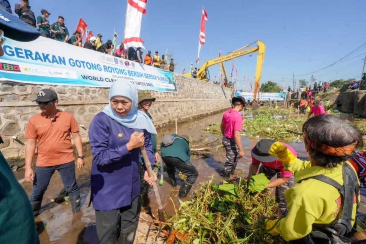 Kota Probolinggo, Jawa Timur (ANTARA) - Gubernur Jawa Timur Khofifah Indar Parawansa menegaskan komitmen menuju Indonesia Bersih 2029 dengan memimpin langsung aksi bersih-bersih menyusuri Sungai Legundi di kawasan RSUD Ar-Rozy Kota Probolinggo, Sabtu.