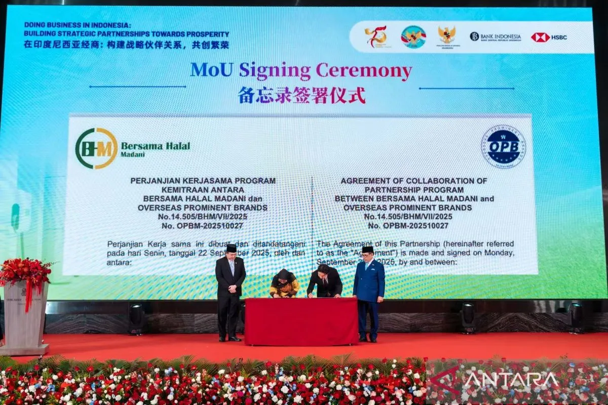 Penandatanganan kerja sama program kemitraan antara "Bersama Halal Madani" dan "Overseas Prominent Brand" China terkait sertifikasi halal yang diselenggarakan dalam acara "Indonesia – Southern China Business Forum (ISCBF)" di Guangzhou, provinsi Guangdong pada Senin (22/9). (ANTARA/HO-KJRI Guangzhou)