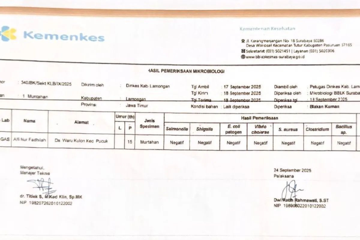 "Hasil laboratorium dari sampel makanan, sisa makanan dari sekolah, hingga muntahan siswa semuanya negatif. Tidak ada keterkaitan dengan menu MBG hari itu," ujarnya saat dikonfirmasi di Lamongan, Jawa Timur, Jumat.