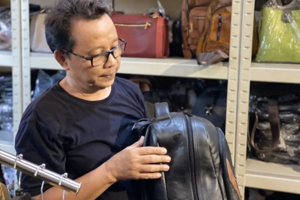 Pengrajin kulit Sam Khuret menunjukkan produknya di Sidoarjo, Jawa Timur, Kamis (9/10/2025). (ANTARA/Astrid Faidlatul Habibah)