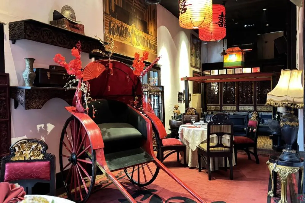 Becak berukuran besar layaknya delman itu dihiasi dengan berbagai ornamen berwarna merah, sehingga semakin menambah kesan romantis yang pas dengan suasana redupnya lampu di resto ini.