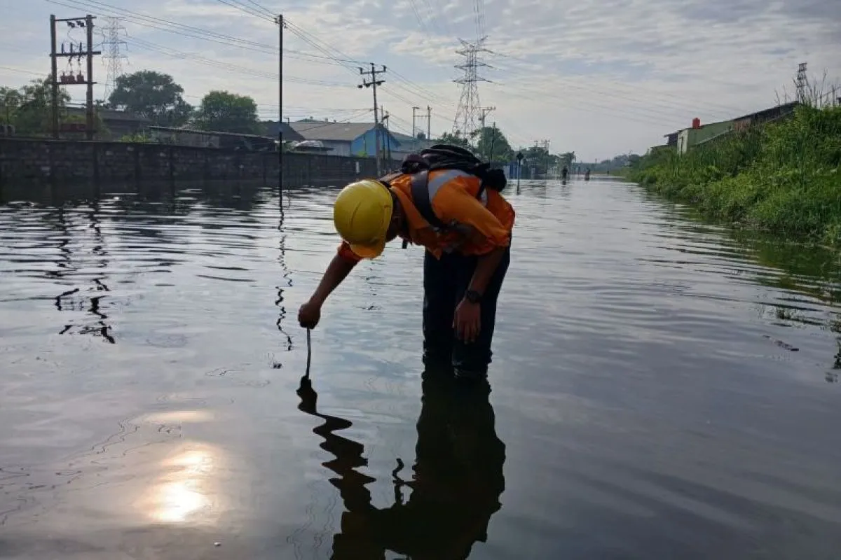 Petugas KAI sedang melakukan pengukuran ketinggian luapan air di jalur KA antara Stasiun Alastua-Semarang Tawang, Rabu (29/10/ 2025). ANTARA/HO-Humas KAI Jember