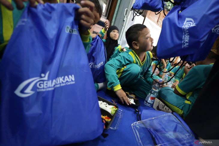 Sejumlah siswa menerima bingkisan makanan olahan ikan saat kegiatan bertajuk Gemarikan Goes to School di SD Negeri Singonegaran 1, Kota Kediri, Jawa Timur, Kamis (20/11/2025). Gerakan gemar makan ikan yang diselenggarakan Pemerintah Kota Kediri tersebut sebagai upaya mengkampanyekan pentingnya mengkonsumsi ikan guna mendorong kecerdasan anak sekaligus memperingati Hari Ikan Nasional. ANTARA Jatim/Prasetia Fauzani/mas.