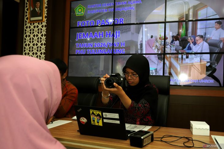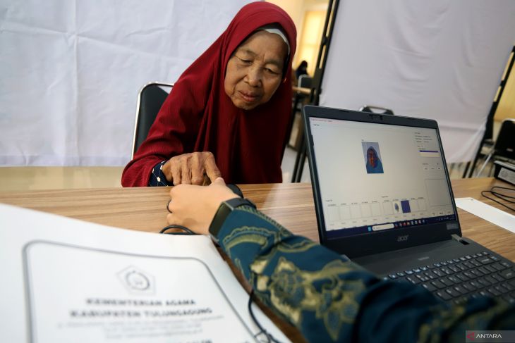 Petugas Imigrasi melakukan perekaman data jamaah calon haji di Aula Kantor Kementrian Agama Tulungagung, Jawa Timur, Selasa (25/11/2025). Kantor Imigrasi Kelas II Non TPI Blitar telah melaksanakan pelayanan jemput bola pembuatan paspor untuk 927 orang jamaah calon haji musim haji 2026 asal Tulungagung dan Blitar yang bekerjsama dengan sejumlah kelompok bimbingan ibadah haji (KBIH) guna memudahkan jamaah calon haji untuk mendapatkan pelayanan keimigrasian yang tepat,cepat, dan prima. ANTARA FOTO/Irfan Anshori Petugas Imigrasi Kelas II Non TPI Blitar melakukan perekam data pemohon pembuatan paspor jamaah calon haji di Pamulang, Tangerang Selatan, Banten, Rabu (15/10/2025). Kantor Imigrasi Kelas II Non TPI Blitar telah melaksanakan pelayanan jemput bola pembuatan paspor untuk 927 orang jamaah calon haji musim haji 2026 asal Tulungagung dan Blitar yang bekerjsama dengan sejumlah kelompok bimbingan ibadah haji (KBIH) guna memudahkan jamaah calon haji untuk mendapatkan pelayanan keimigrasian yang tepat,cepat, dan prima. Antara Jatim/Irfan Anshori/um