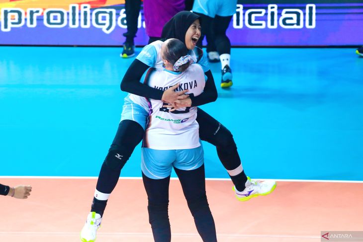 Pevoli Jakarta Pertamina Enduro Megawati Hangestri Pertiwi berselebrasi dengan rekannya Irina Voronkova usai mengalahkan tim Jakarta Popsivo Polwan saat pertandingan putaran pertama Final Four Proliga 2026 di Jawa Pos Arena, Surabaya, Jawa Timur, Sabtu (4/4/2026).Jakarta Pertamina Enduro mengalahkan Jakarta Popsivo Polwan dengan skor 3-1 (25-18, 25-19, 18-25 dan 25-23). ANTARA JatimMoch Asim.