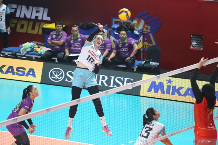 Pevoli Jakarta Pertamina Enduro Megawati Hangestri Pertiwi (kiri) mengembalikan bola yang berusaha ditahan pevoli Jakarta Popsivo Polwan Malwina Smarzek (tengah) dan Agfarida Dessy Maharani (kanan) saat pertandingan putaran pertama Final Four Proliga 2026 di Jawa Pos Arena, Surabaya, Jawa Timur, Sabtu (4/4/2026).Jakarta Pertamina Enduro mengalahkan Jakarta Popsivo Polwan dengan skor 3-1 (25-18, 25-19, 18-25 dan 25-23). ANTARA JatimMoch Asim.