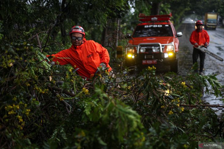 Petugas BPBD mengevakuasi pohon tumbang di ruas jalan nasional Nganjuk, Jawa Timur, Sabtu (11/4/2026). Menurut BPBD Kabupaten Nganjuk, sedikitnya tujuh pohon di kawasan itu tumbang akibat hujan deras disertai angin kencang sehingga menyebabkan kemacetan lalu lintas di jalan nasional. Antara JatimMuhammad Mada/abs