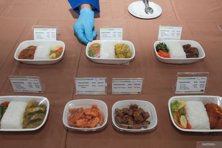 Menu makanan jamaah calon haji. Seorang juru masak menunjukkan contoh hidangan untuk jamaah calon haji selama dalam penerbangan saat tes makanan (meal test) di Asrama Haji Sukolilo Surabaya, Surabaya, Jawa Timur, Jumat (17/4/2026). Kegiatan tersebut untuk memastikan standardisasi makanan yang disajikan kepada jamaah calon haji selama berada dalam pesawat saat penerbangan ke Tanah Suci. Antara Jatim/Didik Suhartono/abs