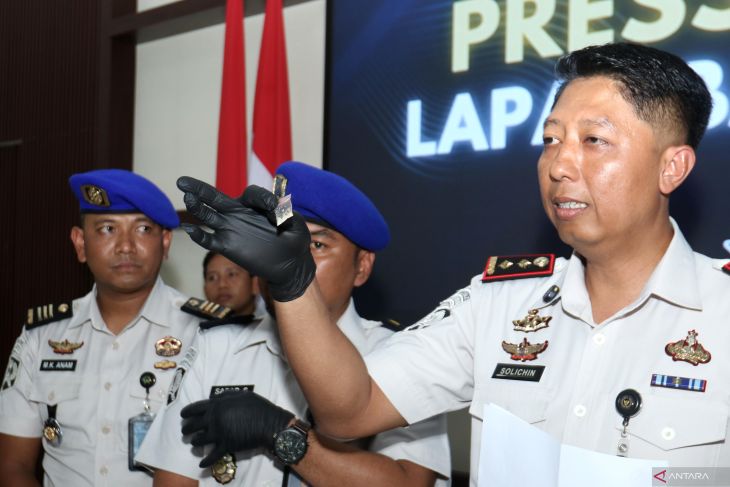 Kepala Lembaga Pemasyarakatan Kelas IIA Banyuwangi Solichin (kanan) menunjukan narkotika jenis sabu-sabu pada Konferensi pers di Lapas Banyuwangi, Jawa Timur, Selasa (28/4/2026). Petugas Lapas mengamankan seorang perempuan berinisial EM yang kedapatan membawa dua Paket sabu saat hendak menjenguk narapidana di dalam lapas. ANTARA Jatim/Budi Candra Setya/mas.