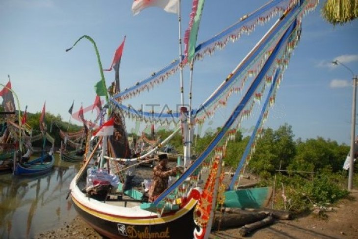 Pamekasan (Antara Jatim)-Nelayan menghias perahu, di Desa Lembung, Galis, Pamekasan, Puluhan nelayan di desa itu menghias perahu mereka untuk memeriahkan upacara petik laut yang akan digelar Rabu (11/9). FOTO/Saiful Bahri/13/Oka.