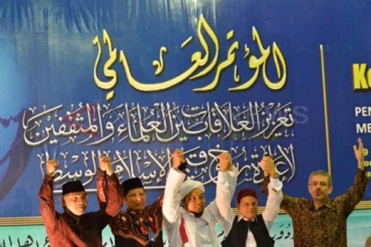 Situbondo (Antara Jatim) - Dari kiri ke kanan tampak Direktur Eksekutif Conference of Islamic Scholars (ICIS) Nasihin Hasan, Intelektual muda NU Cholil Nafis, Pengasuh Pondok Pesantren Salafiyah Syafi'iyah KHR. Ahmad Azaim Ibrahimy, Duta Besar Libya Shodiq Muhammad Bin Shodiq dan Duta Besar Syiria Bassam Khatib mengangkat tangan usai membacakan rekomendasi hasil Konferensi Internasional Ulama dan Cendekiawan Muslim ( International Conference of Islamic Scholars) di Pondok Pesantren Salafiyah Syafi'iyah Sukorejo, Banyuputih, Situbondo, Jawa Timur, Minggu (30/3). Konferensi tersebut melahirkan pemikiran dan rekomendasi, di antaranya tentang pentingnya meningkatkan ekonomi umat Islam di seluruh penjuru dunia untuk kemandirian dan terlepas dari ketergantungan pihak asing. (FOTO Seno/14/edy)