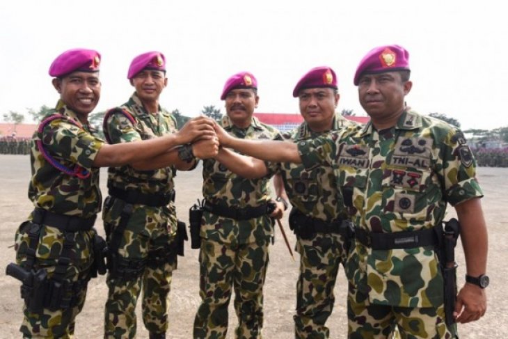 Surabaya (Antara Jatim) - Komandan Pasmar-1 Brigjen TNI (Mar) Kasirun Situmorang (tengah) bersama Kolonel Marinir Iwan Hermawan (Kanan), Kolonel Marinir Ludi Prastyono (kedua kanan), Letkol Marinir Freddy Ardianza (kedua kiri) dan Mayor Marinir Rivelson Saragih (kiri) melakukan salam komando usai upacara serah terima jabatan Komandan Resimen Bantuan Tempur-1 Marinir dan Komandan Batalyon Intai Amfibi-1 Marinir di Bhumi Marinir Karangpilang, Surabaya, Jawa Timur, Kamis (30/4). Posisi Komandan Menbanpur-1 Mar diserakan kepada Kolonel Marinir Ludi Prastyono menggantikan Kolonel Marinir Iwan Hermawan dan posisi Komandan Batalyon Intai Amfibi-1 Marinir diserahkan kepada Mayor Marinir Rivelson Saragih menggantikan Letkol Marinir Freddy Ardianza. foto Zabur Karuru/15/Chan.