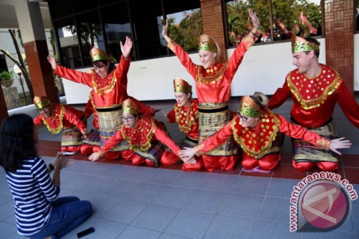 Sejumlah mahasiswa Queensland University of Technology (QUT) Australia berlatih tari Saman asal Aceh di Universitas Surabaya (Ubaya), Surabaya, Jawa Timur, Selasa (7/7). Kegiatan tersebut serangkaian dari "Summer Program" yang diikuti delapan mahasiswa dalam mengenal kekayaan budaya Indonesia. Antara Jatim/M Risyal Hidayat/15