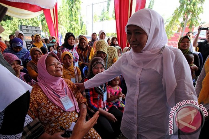 Menteri Sosial Khofifah Indar Parawansa (kanan) menyapa warga penerima bantuan Program Keluarga Harapan (PKH) tahap ketiga di kantor Kecamatan Wonoasih, Probolinggo, Jawa Timur, Sabtu (17/10). Pemerintah melalui kementerian sosial menargetkan penerima bantuan PKH untuk tahun anggaran 2016 bertambah dari 3,5 juta keluarga menjadi 6,5 juta keluarga untuk mengurangi kemiskinan dan meningkatkan kualitas sumberdaya manusia. Antara Jatim/Moch Asim/zk/15