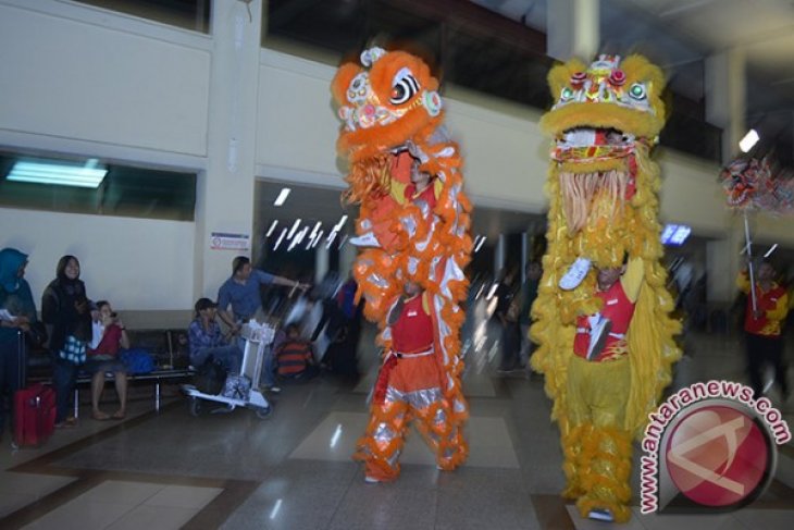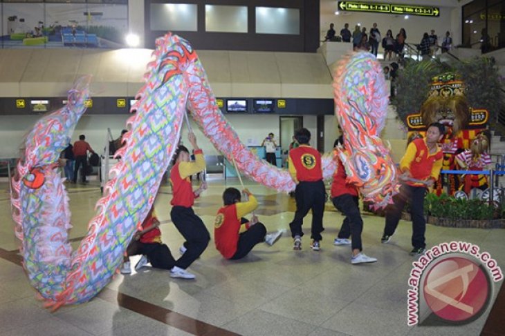Atraksi tarian liong dipertunjukan kepada penumpang dan pengunjung bandara di Terminal 1 Bandara Internasional Juanda, Surabaya, Jawa Timur, Jumat (5/2). Pertunjukan tersebut untuk menghibur pengunjung Bandara di area publik terminal dan menyambut Tahun Baru Imlek 2567. Antara Jatim/Umarul Faruq/zk/16