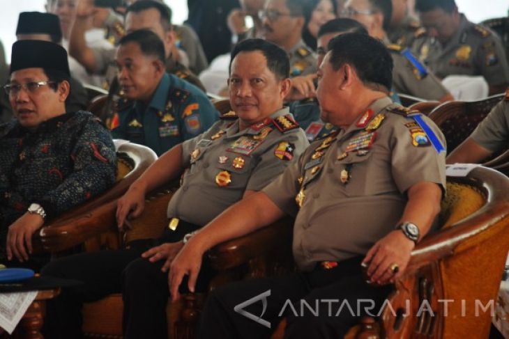 Kapolri Jenderal Tito Karnavian (tengah) Kapolda Jatim Irjen Pol Anton Setiadji (kanan) Ketua DPRD Jawa Timur Abdul Halim Iskandar (kiri) saat kegiatan Bhakti Sosial pengobatan gratis di lapangan Jenggolo, Gedangan, Sidoarjo, Jawa Timur, Sabtu (19/11). Bakti Sosial kesehatan Polri di wilayah jajaran Polda Jatim tersebut dalam rangka pelaksanaan program prioritas Kapolri (Promoter) sebagai wujud kepedulian Polri terhadap kesehatan masyarakat. Antara Jatim/Umarul Faruq/zk/16