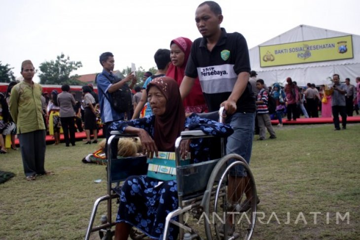 Sejumlah warga mengikuti kegiatan Bhakti Sosial pengobatan gratis di lapangan Jenggolo, Gedangan, Sidoarjo, Jawa Timur, Sabtu (19/11). Bakti Sosial kesehatan Polri di wilayah jajaran Polda Jatim tersebut dalam rangka pelaksanaan program prioritas Kapolri (Promoter) sebagai wujud kepedulian Polri terhadap kesehatan masyarakat. Antara Jatim/Umarul Faruq/zk/16